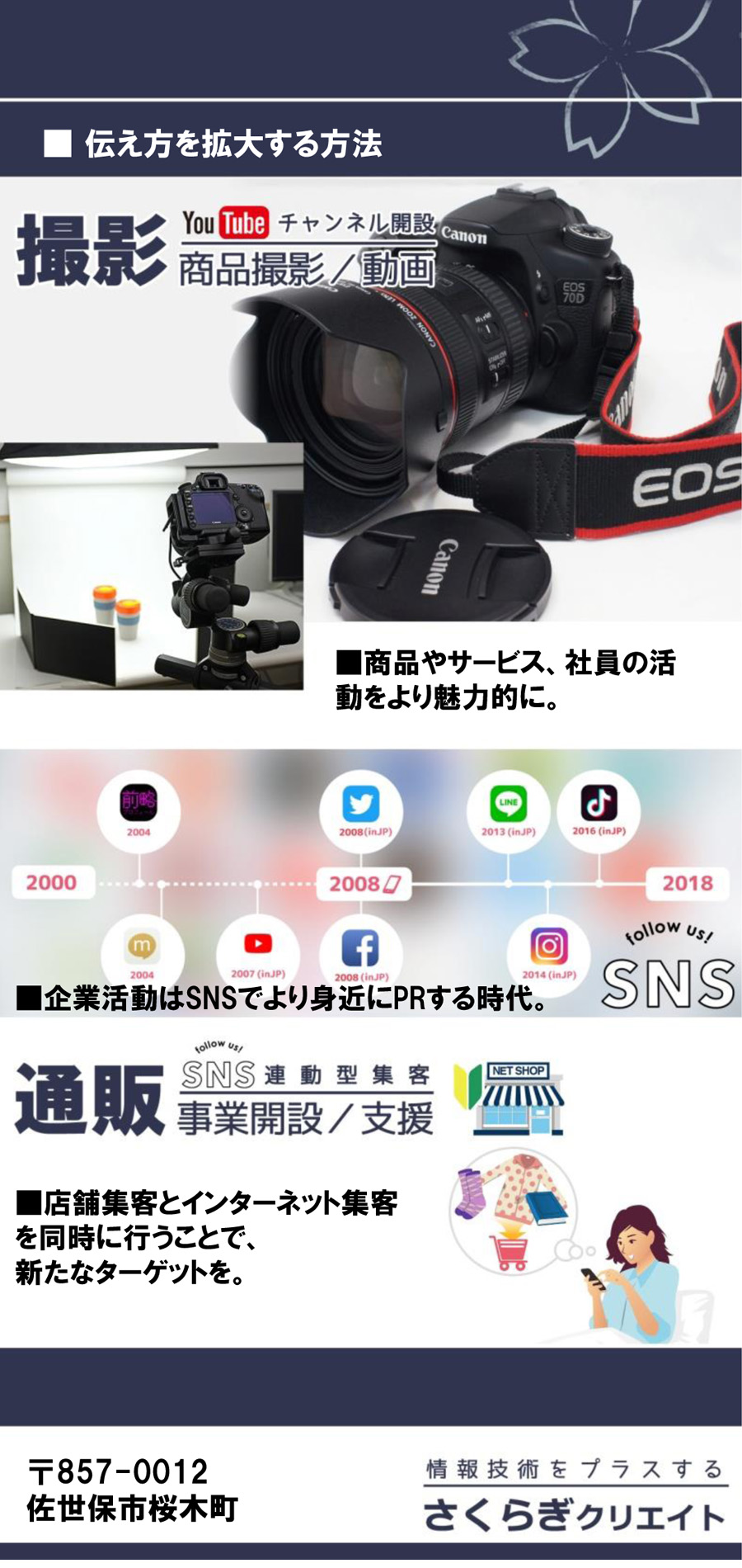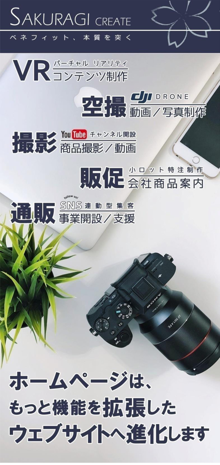 新技術バーチャルリアリティ(VR)コンテンツ、屋内または屋外のドローンによる空撮映像コンテンツ。企業や商品のプロモーション動画。ホームページと連動した販売促進を行います。